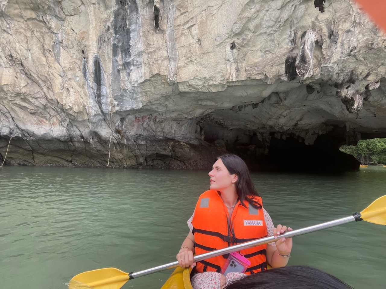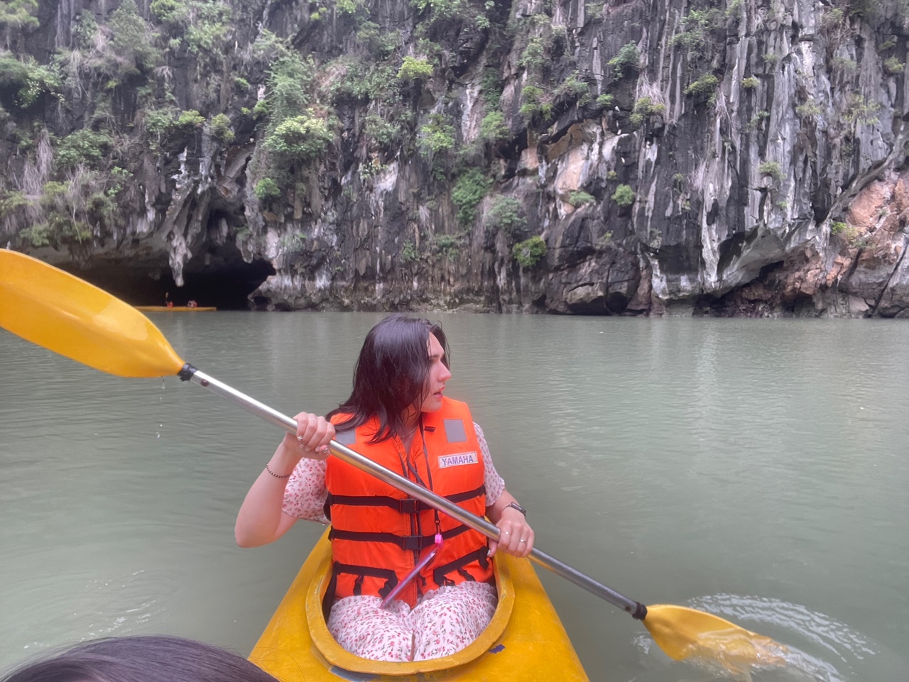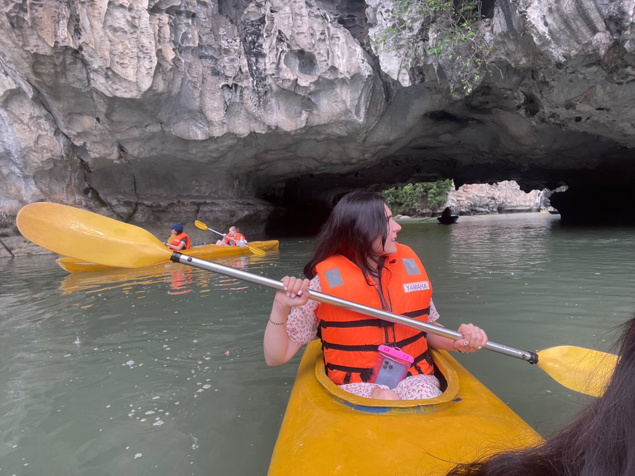 Once we reached Ha Long Bay, we boarded our boat and began cruising through the emerald waters, surrounded by towering limestone karsts. Along the way, we took a break and hopped into kayaks, paddling through serene waters and exploring hidden lagoons. It was an incredible way to get up close to the bay’s natural beauty.
